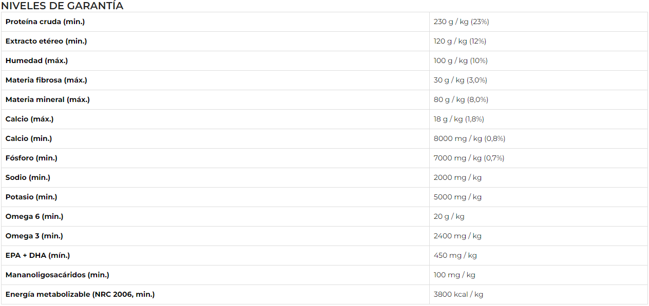 Harina de salmón, harina de ave, chuletas de arroz, grano de maíz1, salvado de gluten de maíz-601, grano de sorgo, aceite de ave, aceite de pescado refinado, aceite de linaza, pulpa de remolacha ( min.0,2%), salvado de trigo, levadura de cerveza seca, cloruro de sodio (sal común), cloruro de potasio, hidrolizado de hígado de aves y cerdos, aditivo prebiótico (pared celular de levadura – fuente de mananoligosacáridos), extracto Yuca (mín. 0.025%), Antioxidantes naturales (Concentrado de tocoferol), Propionato de calcio, Sorbato de potasio, Aditivo adsorbente (Pared celular de levadura – Glucanos), Vitaminas (A, D3, E, K3, C, B1, B2, B6, B12, pantotenato de calcio, ácido fólico, ácido nicotínico, biotina, cloruro de colina), minerales (sulfato de zinc, sulfato de hierro, sulfato de manganeso, yodato de calcio,Selenito de sodio), Minerales quelados (Proteinato de manganeso, Levadura enriquecida con selenio, Proteinato de zinc, Proteinato de cobre).